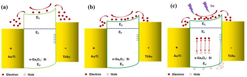 圖3. MSM光電探測器載流子傳輸和能帶示意圖:(a) 低摻雜濃度在黑暗條件下,(b) 高摻雜濃度在黑暗條件下,以及 (c) 紫外光條件下。