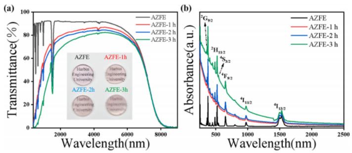研究團(tuán)隊(duì)通過熔融淬火法制備了新型的Er3+摻雜的ZnF2-AlF3基氟化物玻璃,并通過一步熱處理法制備了具有ZnF2單相納米晶的氟化物玻璃陶瓷。熱處理后的玻璃陶瓷樣品在2μm之后至截至透過邊帶前仍然保持著70%以上的透過率。