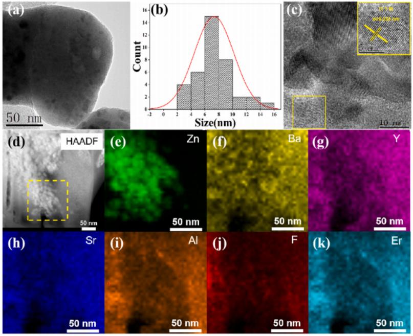 隨后,通過X射線衍射測試,證實(shí)了具有單相的ZnF2納米晶體在玻璃樣品中析出,晶粒大小在8μm左右。透射電鏡的測試結(jié)果表明ZnF2晶體在玻璃樣品中均勻析出,并且Er3+在晶體區(qū)域出現(xiàn)了明顯的富集現(xiàn)象。稀土元素富集在具有較低聲子能量的晶體附近會降低非輻射馳豫速率從而起到增強(qiáng)熒光發(fā)射的效果。