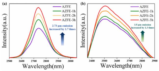 *后,基于Er3+摻雜的氟化物玻璃陶瓷樣品,對其進(jìn)行了從可見至中紅外的熒光發(fā)射測試。測試發(fā)現(xiàn)氟化物玻璃陶瓷樣品在激發(fā)光的激發(fā)下展現(xiàn)出更強(qiáng)的可見光發(fā)射。通過一系列的全光譜發(fā)光測試,得到氟化物玻璃陶瓷樣品在可見和近紅外波段的發(fā)光增加了近10倍以上,在中紅外2.7μm和3.5μm波段也有較為明顯的增強(qiáng)效果。