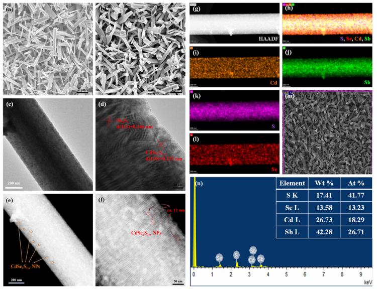 圖1 (a) Sb2S3納米棒的SEM圖像,(b) Sb2S3@CdSexS1-x光電極的SEM圖像,(c) TEM圖像,(d) 高分辨TEM圖像,(e, f) HAADF圖像,(g–l) Cd、Sb、S和Se的元素分布圖,以及(m, n) Sb2S3@CdSexS1-x光電極的EDS光譜。