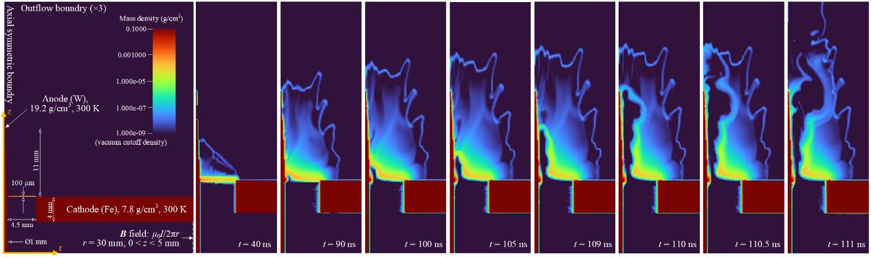 研究結(jié)果表明:EWE等離子體的運(yùn)動(dòng)可分為三個(gè)階段:(1)初始階段,金屬絲爆炸產(chǎn)生等離子體,冷密的絲芯主體質(zhì)量與電流路徑保持靜止;(2)運(yùn)動(dòng)階段,部分等離子體受磁壓力作用向陽極桿尖端移動(dòng);(3)X射線輻射階段:受等離子體不穩(wěn)定影響,原電流路徑耗散,電子在磁絕緣的陰陽極間隙中發(fā)射與加速,在陽極尖端聚焦,產(chǎn)生X射線輻射。此外,研究團(tuán)隊(duì)通過電路分析發(fā)現(xiàn),二極管電壓在X射線輻射前開始上升,這一階段的電壓主要來源于等離子體的高速運(yùn)動(dòng)及其電流回路擴(kuò)張帶來的電感的快速變化。隨著原電流路徑的耗散,二極管阻性電壓形成強(qiáng)電場(chǎng)加速電子,*終產(chǎn)生高能X射線。同時(shí),研究團(tuán)隊(duì)利用FLASH磁流體模擬進(jìn)一步驗(yàn)證了實(shí)驗(yàn)發(fā)現(xiàn)。本研究首次系統(tǒng)性地揭示了WS-RPD的等離子體動(dòng)力學(xué)過程,并為未來優(yōu)化低阻抗RPD的X射線轉(zhuǎn)換效率提供了實(shí)驗(yàn)數(shù)據(jù)和理論模型。