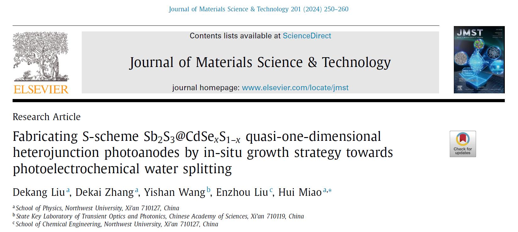 近日,西北大學苗慧課題組在原位生長構(gòu)筑Sb2S3@CdSexS1-x準一維S型異質(zhì)結(jié)光陽極及其光電化學特性研究方面取得進展,研究成果以“Fabricating S-scheme Sb2S3@CdSexS1-x quasi-one-dimensional heterojunction photoanodes by in-situ growth strategy towards photoelectrochemical water splitting”為題發(fā)表在國際期刊Journal of Materials Science & Technology。西北大學物理學院為該論文第一單位,劉康德博士研究生為第一作者,苗慧教授為通訊作者。今天小卓為大家分享該研究成果,希望對您在納米異質(zhì)結(jié)器件光電性質(zhì)研究方面帶來一些靈感和啟發(fā)。