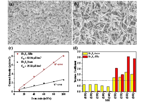 圖2(a)Sb2S3 base和(b)Sb2S3 NRs的SEM圖;(c)雙電層電容測試圖和(d)晶格紋理系數(shù)圖