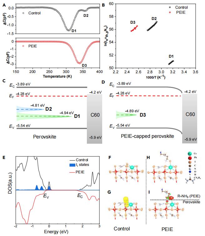 圖2 由鈣鈦礦/PEIE界面反應(yīng)導(dǎo)致的深能級(jí)陷阱鈍化 (A) 裸鈣鈦礦(對(duì)照組,黑色)和PEIE包覆鈣鈦礦器件(PEIE,紅色)的深能級(jí)瞬態(tài)譜(DLTS)信號(hào)。D1、D2和D3表示通過DLTS揭示的少數(shù)載流子的三個(gè)深能級(jí)陷阱。(B) 從DLTS信號(hào)獲得的阿倫尼烏斯(Arrhenius)圖。圖(A)中的數(shù)據(jù)點(diǎn)是通過離散拉普拉斯變換計(jì)算DLTS信號(hào)中包含的內(nèi)部瞬態(tài)得到的,而實(shí)線是對(duì)數(shù)據(jù)點(diǎn)的線性擬合。對(duì)照組(C)和PEIE鈍化(D)器件的能帶結(jié)構(gòu)以及深能級(jí)陷阱。峰的位置和高度分別對(duì)應(yīng)于D1、D2和D3陷阱的深度和密度。導(dǎo)帶*小值(EC)、價(jià)帶*大值(EV)和費(fèi)米能級(jí)(EF)均來自紫外光電子能譜(UPS)。(E) 對(duì)照組鈣鈦礦(黑色)、碘間隙缺陷(Ii,藍(lán)色)和PEIE鈍化鈣鈦礦(紅色)的態(tài)密度(DOS)。(F–I) 分別展示了具有碘間隙缺陷(Ii)的鈣鈦礦表面(對(duì)照組)和PEIE鈍化鈣鈦礦表面(PEIE)的原子結(jié)構(gòu)(F和H)以及電荷轉(zhuǎn)移(G和I)。電子的積累和耗散分別用紅色和綠色表示。