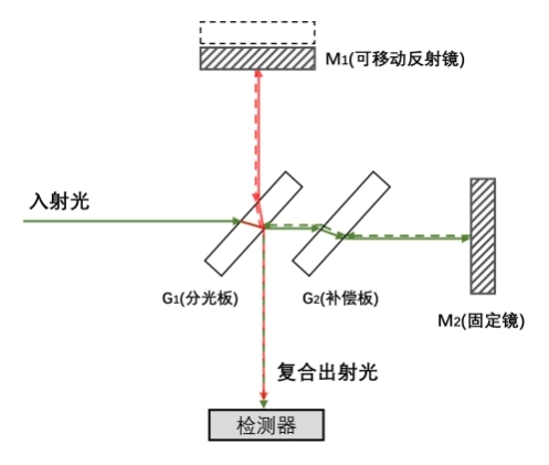 拉曼散射光收集:散射光經(jīng)過(guò)光學(xué)系統(tǒng)收集后,通過(guò)邁克爾遜干涉儀動(dòng)態(tài)測(cè)定干涉圖。透鏡將入射光準(zhǔn)直成一束平行光投射到分光板G1。隨后拉曼散射光被分為兩束,一束到達(dá)動(dòng)鏡M1,另一束經(jīng)反射到達(dá)定鏡M2。兩束光分別經(jīng)過(guò)定鏡和動(dòng)鏡反射后再回到分光板上匯合后射出。復(fù)合出射光因存在光程差而發(fā)生干涉。顯然,干涉圖是光強(qiáng)度I(?)和光程差?的函數(shù)。動(dòng)鏡以恒定速度前后移動(dòng),因此干涉圖也是光強(qiáng)度和時(shí)間的函數(shù)。