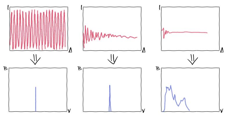 傅里葉變換:攜帶樣品特征信息的干涉光被光電檢測(cè)器轉(zhuǎn)為電信號(hào)。這些信號(hào)先被分解為不同頻率的成分,然后采用傅里葉變換算法進(jìn)行解析,將時(shí)間域的干涉圖轉(zhuǎn)化為強(qiáng)度-頻率函數(shù)關(guān)系,即頻率域的光譜圖(如下圖所示)。該過(guò)程通過(guò)計(jì)算機(jī)代數(shù)完成。