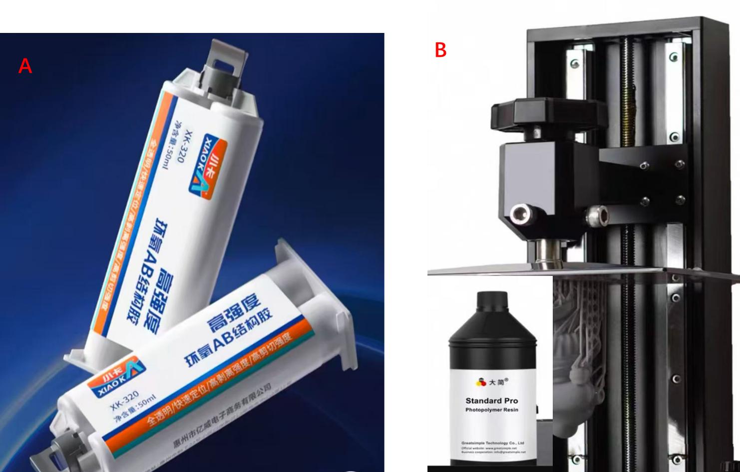 圖2 待測(cè)樣品:胺固化雙酚A環(huán)氧樹脂膠(A)和UV固化膠(B)