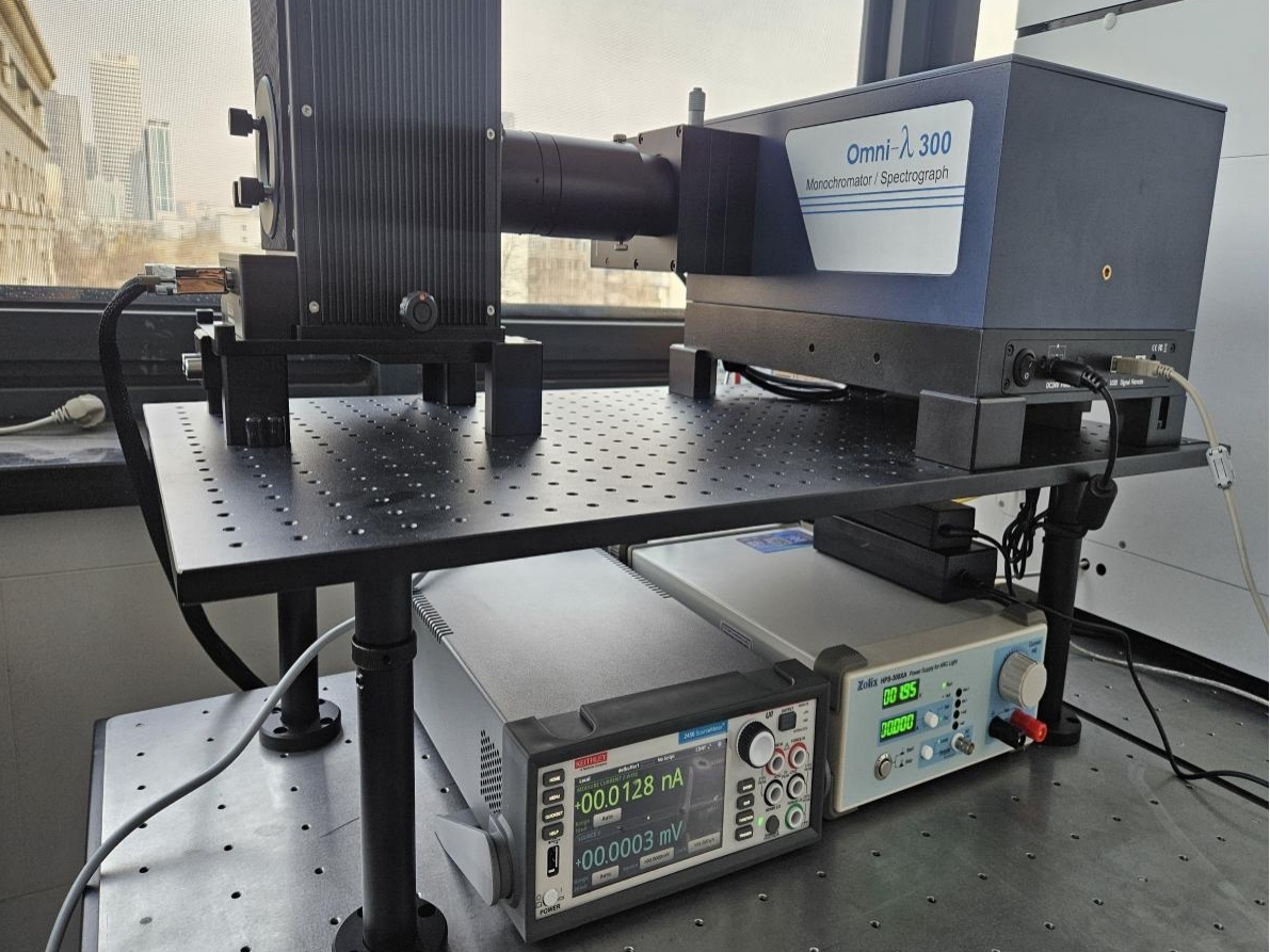 其中DSR300為專用于低維材料光電測(cè)試系統(tǒng),該系統(tǒng)集成高精度光譜掃描,光電流掃描以及光響應(yīng)速率測(cè)試??蛇x配不同倍率的消色差物鏡、反射式紫外物鏡,焦點(diǎn)光斑可達(dá)60μm(圖3),可實(shí)現(xiàn)百微米器件的絕對(duì)光譜響應(yīng)度測(cè)試。搭配了超高穩(wěn)定性氙燈光源,光譜范圍:250-1800nm,不穩(wěn)定性<1%,支持長(zhǎng)時(shí)間的連續(xù)測(cè)試。此外也可擴(kuò)展連續(xù)白光激光器,皮秒脈沖激光器,鹵素光源和黑體光源等等。該系統(tǒng)中集成了Keithley 24系列原表,測(cè)試量程從100μA到1A,分辨率高達(dá)10pA。光譜儀方面搭配了卓立漢光自制的omni-λ300三光柵光譜儀,實(shí)現(xiàn)紫外至紅外的切換,分辨率0.1nm,波長(zhǎng)準(zhǔn)確度±0.2nm,波長(zhǎng)重復(fù)性±0.1nm,配備了6檔自動(dòng)濾光片輪,可有效消除二級(jí)譜(圖4)。
