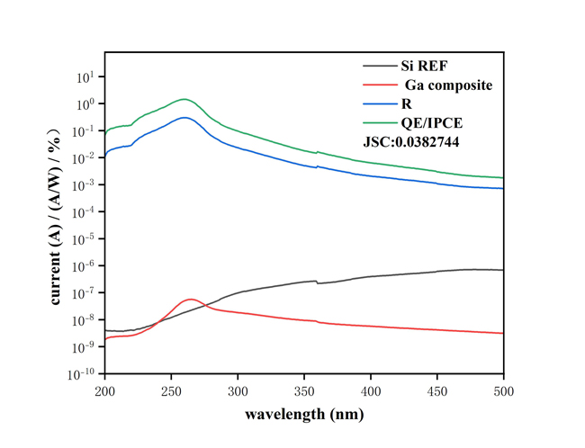 利用標(biāo)準(zhǔn)Si校準(zhǔn)入射光功率后測(cè)得氧化鎵復(fù)合材料的光譜響應(yīng)度、IPCE/EQE、短路電流密度如下(圖6):