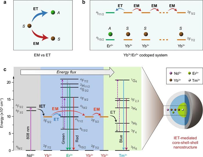近日,華南理工大學發(fā)光材料與器件國家重點實驗室周博教授團隊提出了一種研究微觀尺度能量遷移過程的新策略。通過構建界面能量傳遞IET(Interfacial Energy Transfer)調控的核殼納米結構和能量輸運過程設計,成功觀測到敏化劑/激活劑共摻上轉換體系的能量遷移特性,并通過定義特征參量(γEM)描述了能量遷移和能量傳遞的競爭。該模型以常規(guī)的NaYF4:Yb/Er作為研究對象,以NaYF4:Nd為吸收808 nm敏化光的殼層,通過設計NaYF4:Yb/Tm探測能量遷移。Tm3+的發(fā)光變化反映了NaYF4:Yb/Er中間層里Yb3+→Yb3+能量遷移和Yb3+→Er3+能量傳遞的競爭關系,并進一步采用蒙特卡洛模擬驗證了實驗結論。此外,該模型通過時域調控可進一步實現(xiàn)上轉換光色調控。本研究促進了上轉換動力學過程的深入理解,為操控納米結構中的能量輸運和調控發(fā)光顏色提供了新方法,在邏輯運算和信息安全等方面展示出應用潛力。