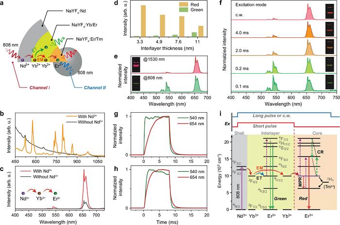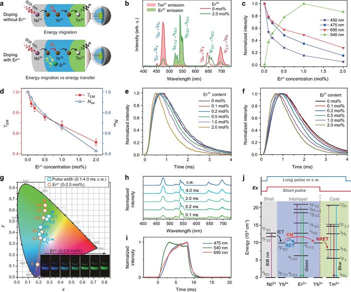 稀土上轉換發(fā)光材料表現(xiàn)出優(yōu)異的發(fā)光學性質,在諸多前沿領域表現(xiàn)出巨大的應用潛力。近期研究發(fā)現(xiàn),能量遷移過程設計在上轉換發(fā)光調控方面具有獨特優(yōu)勢。然而,對于典型的敏化劑/激活劑共摻材料體系而言,能量遷移的發(fā)生及其與能量傳遞等其他過程的競爭關系尚未得到深入研究。而且能量遷移在時間尺度上會與其他過程同時發(fā)生,導致普通方法或材料設計難以將其區(qū)分并挑選出來。因此,如何獲得能量遷移的規(guī)律以及實現(xiàn)對上轉換發(fā)光顏色動力學調控是稀土發(fā)光領域的一項挑戰(zhàn)性課題。