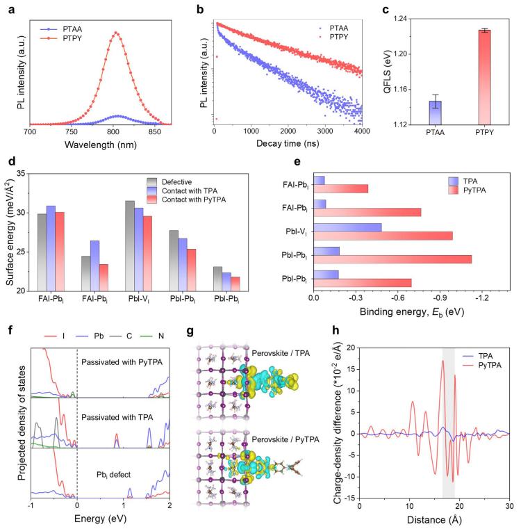 圖1 a)和(b)在PTAA和PTPY上沉積的鈣鈦礦薄膜的穩(wěn)態(tài)光致發(fā)光(PL)光譜和時間分辨光致發(fā)光(TRPL)衰減特性。(c)在PTAA和PTPY上沉積的鈣鈦礦薄膜的準費米能級分裂(QFLS)值。(d)鈣鈦礦在與TPA或PyTPA接觸前后不同缺陷(碘空位:VI,鉛碘反位缺陷:PbI,以及間隙鉛:Pbi)的表面能。注意,FAI和PbI分別表示FAI終止的(001)面和PbI終止的(001)面。(e)分子與各種缺陷之間的結合能(Eb)。(f)有缺陷和經TPA與PyTPA鈍化后的表面的投影態(tài)密度。價帶頂的能級設定為零。(g)TPA和PyTPA組裝在帶有Pbi缺陷的PbI終止鈣鈦礦表面的理論模型。藍色區(qū)域表示電子耗盡,黃色區(qū)域表示電子積累。(h)分子與Pbi缺陷的PbI終止鈣鈦礦表面之間的計算電荷密度差?;疑珟П硎痉肿优c鈣鈦礦表面之間的界面。
