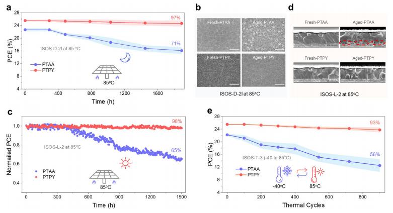 PTPY展現出優(yōu)異的光熱穩(wěn)定性。在85°C的條件下連續(xù)加熱48小時后,PTPY的吸收光譜幾乎無變化,而傳統(tǒng)的Me-4PACz則發(fā)生了顯著變化。熱重分析(TGA)顯示,PTPY的熱分解溫度超過450°C,遠高于Me-4PACz的290°C。在85°C的氮氣氛圍中,未封裝的PTPY基器件在持續(xù)加熱1900小時后仍能保持初始PCE的97%,而PTAA基器件僅保持71%。在85°C的MPP跟蹤測試中,PTPY基器件在1500小時后仍能保持初始PCE的98%,而PTAA基器件則下降了35%。在-40到85°C的熱循環(huán)測試中,PTPY基器件在900個循環(huán)后仍能保持初始效率的93%,而PTAA基器件僅保持56%。