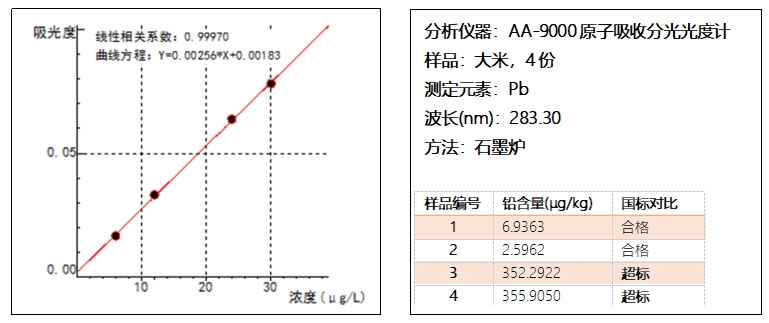 圖2. 標(biāo)準(zhǔn)Pb吸收曲線及大米測定結(jié)果