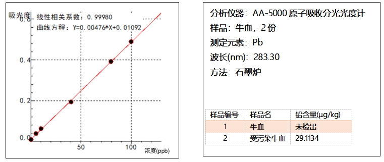 鉛是指血液中含有的鉛元素的量。血鉛超標(biāo)會引起機體的神經(jīng)系統(tǒng)、血液系統(tǒng)、消化系統(tǒng)的一系列異常表現(xiàn),影響人體的正常機能。食品污染、環(huán)境污染可以導(dǎo)致人體血鉛增高,常引起群體性中毒事件。圖3為使用卓立漢光AA-5000原子吸收分光光度計牛血液中鉛含量測試的示例。測試結(jié)果可知,2號牛血樣品鉛含量為29ppb,受到了鉛污染。