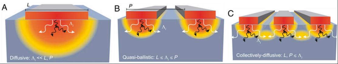圖3 納米尺度熱傳輸由三個特征尺度決定[PNAS, 2015, 112(16): 4846–4851]:熱源尺寸 L、熱源間距 P 以及載熱聲子的 MFP Λi。(A) 當所有 MFP 都小于 L 時,散熱完全來自擴散效應。(B) 當 L 收縮時,長 MFP 聲子呈彈道狀傳播,相對于擴散預測,散熱速率有所降低,此時短 MFP 聲子仍保持擴散性。(C) 當 L 和 P 同時減小,來自相鄰熱源的長 MFP 聲子會像來自單個大型熱源一樣相互作用,從而實現(xiàn)更高效的擴散式傳熱。