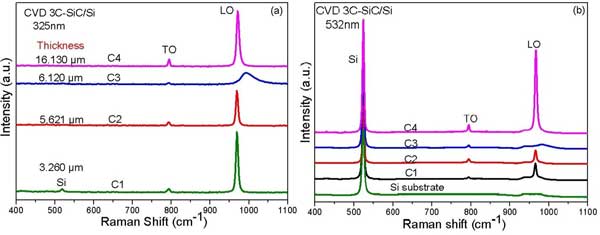 圖1 四個(gè)3C-SiC/Si(100)樣品的拉曼光譜,分別由325 nm(a)和532 nm(b)激光激發(fā)。