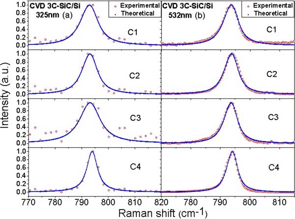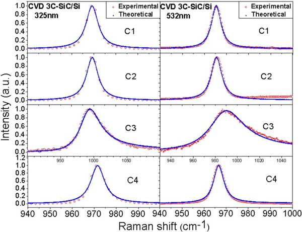 廣西大學(xué)馮哲川教授課題組采用化學(xué)氣相沉積法在硅襯底上生長(zhǎng)一系列不同厚度的3C-SiC薄膜。采用不同的激發(fā)源做拉曼光譜研究,并應(yīng)用空間相關(guān)模型、本振聲子和等離子體耦合(LOPC)模型來(lái)分析薄膜的結(jié)構(gòu)變化,得到不同深度薄膜光學(xué)模式的特征變化。