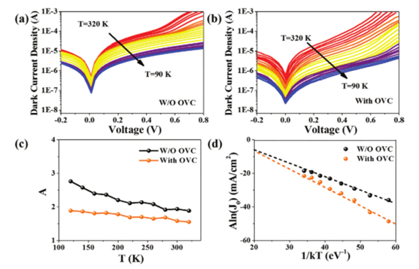 圖5 有/無(wú)OVC結(jié)構(gòu)CIGS器件在不同溫度下暗態(tài)J-V曲線