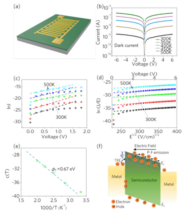 圖1.(a)MSM ε-Ga2O3 SBPD的結構示意圖。(b)在不同溫度下暗場中I-V曲線。(c)ln(J)/V和(d)ln(J/E)/E1/2隨溫度的變化曲線(e)參數(shù)c(T)和1/T的關系曲線及其線性擬合。(f)MSM ε-Ga2O3 SBPD能帶圖中TFE和PFE的示意圖。