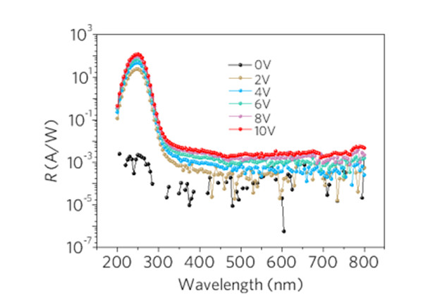 圖3.不同偏壓下,半對數(shù)坐標中MSM ε-Ga2O3 SBPD的光譜響應曲線。