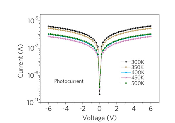 圖6. MSM ε-Ga2O3 SBPD的I-V曲線對溫度的依賴關系。