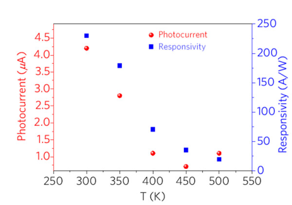 圖7.光電流和響應度隨溫度的變化曲線。
