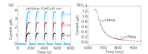 圖8(a)顯示了不同偏置電壓下光電特性隨時間的變化,器件對波長254nm的光照具有良好響應、再現(xiàn)性和穩(wěn)定性,在重復開關光源時器件衰減速度很快。為了獲得更準確的恢復時間,將該瞬時響應的衰減階段放大后繪制在圖8(b)中。MSM ε-Ga2O3 SBPD器件的衰減時間τd1和τd2分別為24和79 ms。這兩個值與之前報道的Ga2O3光電探測器相比有明顯提高。