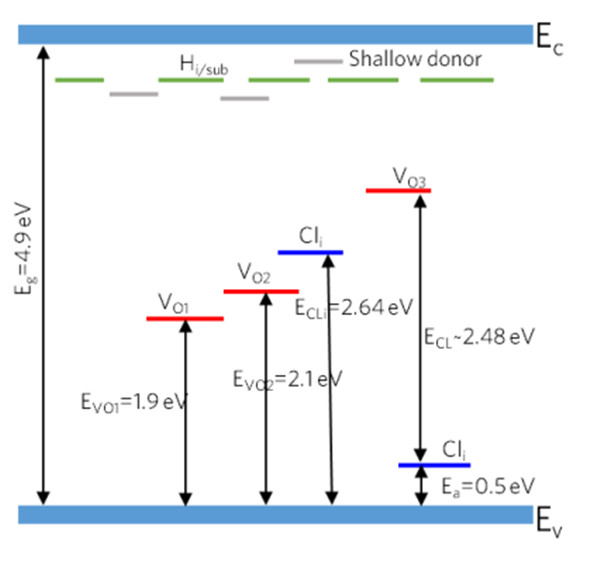 此外,本文研究了氫和氯摻雜有關的缺陷態(tài),在圖9(c)中可以觀察到,深能級缺陷狀態(tài)可以被氫鈍化,得到Ga2O3中的一個淺層施主。MSM ε-Ga2O3 SBPD快速的響應速度歸功于這些缺陷能級的鈍化。同樣地,如圖9(d)所示,Cl作為間隙雜質(zhì)時,將在ε-Ga2O3的帶隙中引入位于VBM上方的兩個缺陷能級。當Cl作為替位雜質(zhì),缺陷移動到導帶底(CBM),但在價帶頂(VBM)附近仍然存在深能級缺陷態(tài)。圖11給出了ε-Ga2O3能帶圖。