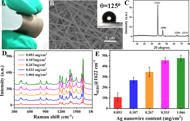 圖2: Ag NWs@PDMS的形貌及Ag NWs量對(duì)SERS性能的影響。