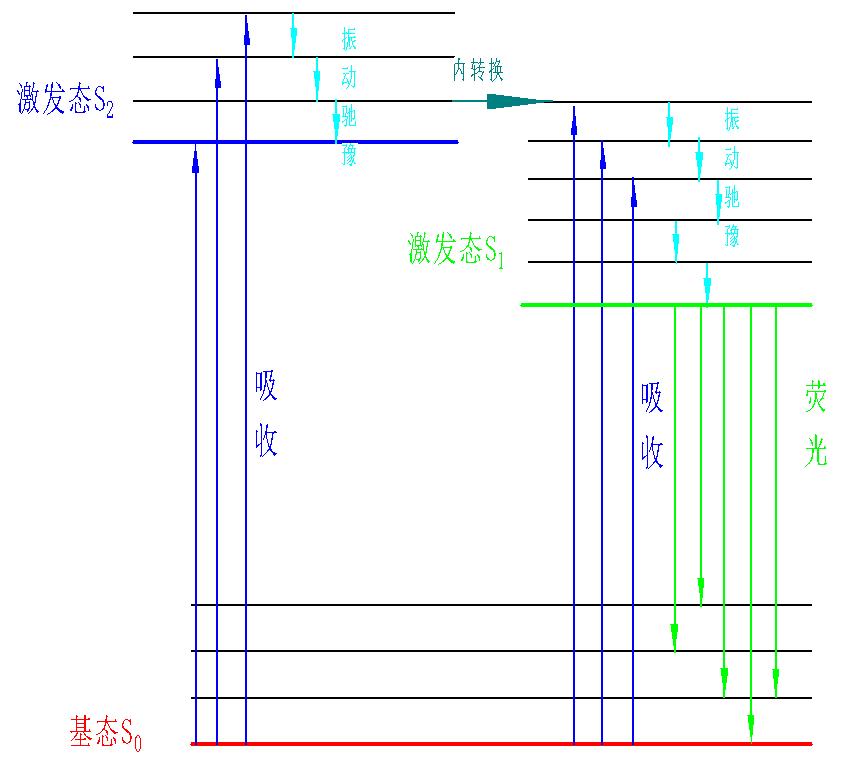 熒光的產生主要是組成發(fā)光材料的分子的能級輻射躍遷的結果。組成熒光物質的分子的價電子能級因為分子的振動和旋轉,又分裂出分子振動能級和分子轉動能級。價電子在被能量較強的光照射后,價電子吸收光子,被激發(fā)到價電子激發(fā)態(tài)(S1,S2...Sn),處于激發(fā)態(tài)的分子不穩(wěn)定,通過非輻射躍遷(振動馳豫,內轉換)以傳熱方式失去部分能量回到第一激發(fā)態(tài)的最低振動能級,然后輻射躍遷返回激態(tài)的各個振動能級,并釋放能量小于等于激發(fā)光子能量的熒光。整個過程通常在ns級,對于人眼是一瞬間的完成的,因此熒光在去掉激發(fā)源后,馬上停止發(fā)光。