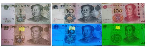 下圖為第五版人民幣在日光燈和紫外燈下的對比圖片。