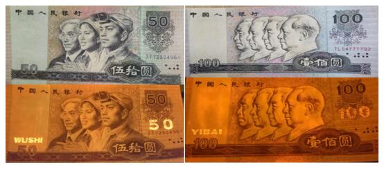 下圖為第四版人民幣在日光燈和紫外燈下的對比圖片。