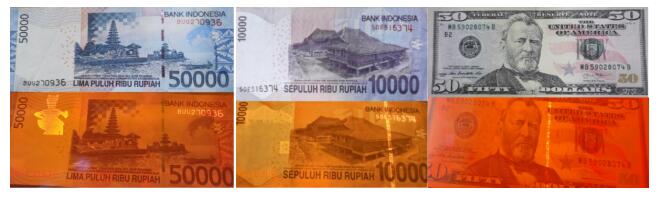 下圖為一些國外紙幣在日光燈和紫外燈下的對比圖片。