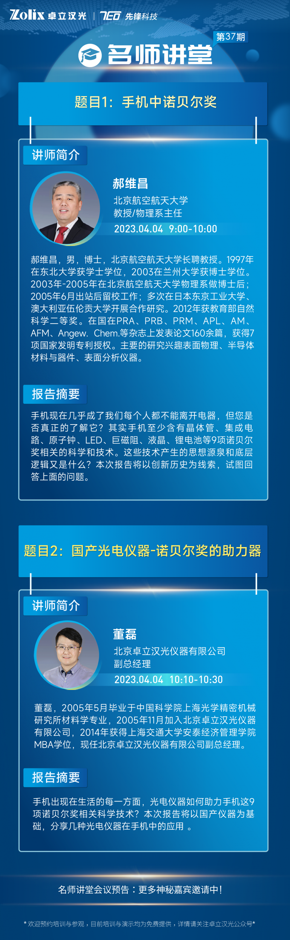 本期卓立漢光隆重邀請(qǐng)到了北京航空航天大學(xué)教授、物理系主任郝維昌老師和卓立漢光董磊副總經(jīng)理,兩位老師將與大家分享自己科研領(lǐng)域的經(jīng)驗(yàn)和心得體會(huì)。希望本次講座能夠?yàn)槟目茖W(xué)研究帶來(lái)靈感與助力,推動(dòng)研究的進(jìn)展,精彩不容錯(cuò)過(guò),掃描下方的二維碼,趕快報(bào)名開(kāi)啟學(xué)習(xí)之旅吧~