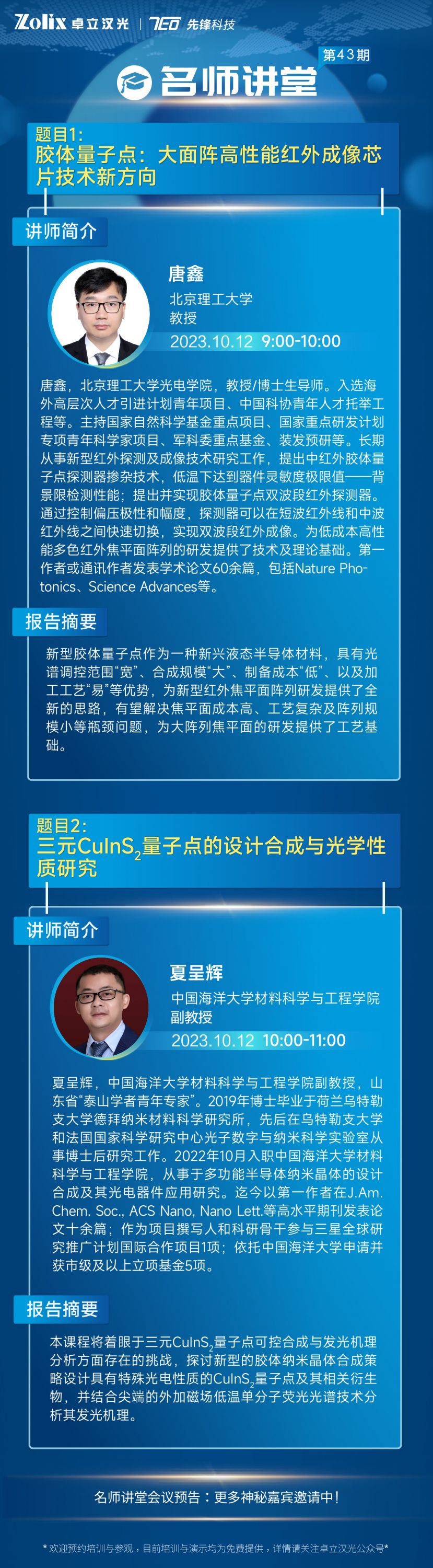 為了與大家共同感受諾貝爾化學獎-量子點的科技魅力,本期卓立漢光特別隆重邀請到了北京理工大學—唐鑫教授和中國海洋大學材料科學與工程學院—夏呈輝副教授,與大家分享在膠體量子點研究領域的經(jīng)驗和心得體會,希望本次講座能夠為您的科學研究帶來靈感與助力,推動研究的進展,精彩不容錯過,趕快報名開啟學習之旅吧~