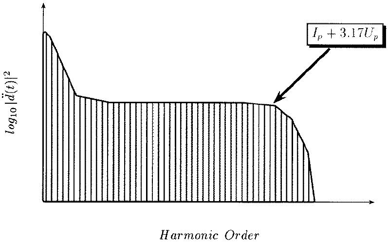 圖1、氣體高次諧波譜的簡單示意圖,包含了氣體高次諧波譜的光譜形狀基本特征。在低級次處高次諧波強度快速下降,對應于傳統(tǒng)的微擾非線性光學區(qū)域;隨后是一個強度變化相對比較平緩的平臺區(qū),在Ip+3.17Up附近高次諧波強度再次急劇下降,對應于高次諧波截止區(qū)。