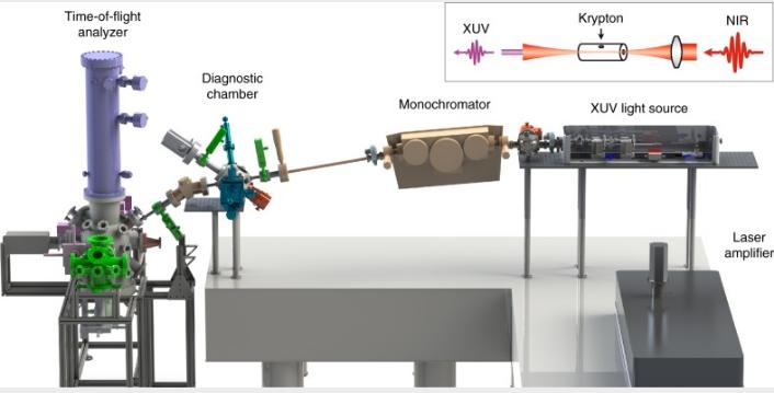 圖2、基于XUV的時間分辨ARPES裝置。插圖(右上)顯示了近紅外(NIR)光通過氪氣產(chǎn)生高次諧波(HHG)以產(chǎn)生極紫外(XUV)光的實驗布局[Nature Communications, 06 Aug 2019, 10(1):3535]