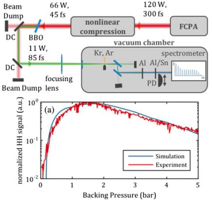 幾乎所有的氣體高次諧波實驗所得到的諧波譜都表現(xiàn)出同一個特征:隨著諧波級次的增加,開始一些低次諧波效率單調下降,緊接著出現(xiàn)一個所謂的“平臺”;在平臺區(qū)內,諧波的強度隨諧波級次的增加下降得非常緩慢;在平臺區(qū)末端的某一級次諧波附近,諧波強度迅速下降,出現(xiàn)截止。這意味著一個非常重要的優(yōu)勢,即它產(chǎn)生了從真空紫外到X射線的寬帶頻譜。目前,實驗上獲得的*短高次諧波輻射波長已經(jīng)達到<1 nm [Science, 2012, 336: 1287.]。通過中紅外激光脈沖與多價態(tài)離子相互作用甚至可以產(chǎn)生光子能量達到~5.2 keV的高光子能量的諧波輻射[Optica Vol. 9, No. 9,1003,September2022]。