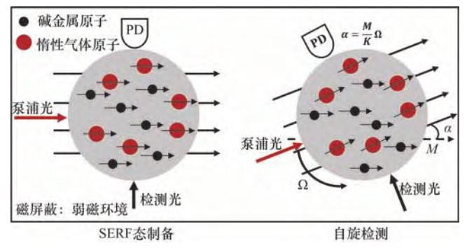 SERF原子自旋陀螺儀利用電子自旋敏感物體轉(zhuǎn)動,具有精度高、體積小的特點(diǎn)。其主要工作過程為原子SERF態(tài)制備以及原子自旋進(jìn)動檢測。其工作原理如圖 6所示,磁屏蔽裝置使原子處于近零磁場環(huán)境中,此時堿金屬原子的拉莫爾進(jìn)動頻率大幅降低,同時由于高密度高壓環(huán)境使自旋交換率極大提升,從而充分抑制原子的自旋交換弛豫,實現(xiàn)SERF態(tài)。當(dāng)載體轉(zhuǎn)動時,由于電子自旋的定軸性,檢測激光與電子自旋產(chǎn)生的宏觀磁矩M間存在夾角α,通過檢測該角度即可得到載體轉(zhuǎn)動信息。
