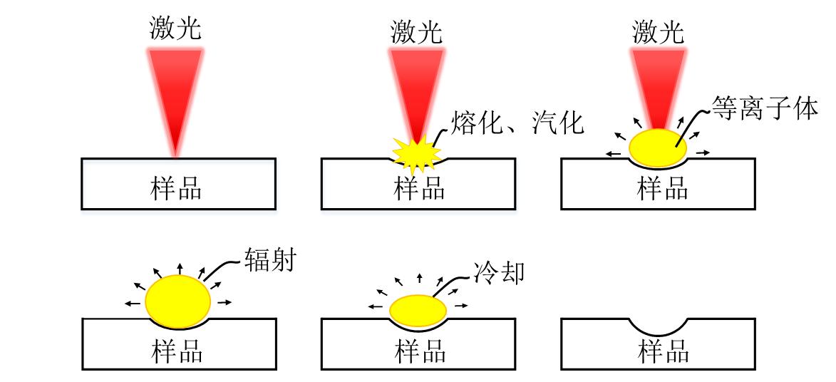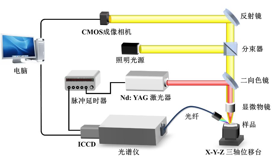 元素分布成像是一種能夠?qū)⒖臻g坐標(biāo)與元素組成信息聯(lián)系起來的分析技術(shù),通過對樣品中元素成份微米級別的空間分布進(jìn)行定性或定量評估,讓人們對物質(zhì)的演化、材料的組成、雜質(zhì)的分布等進(jìn)行更深入的分析。激光誘導(dǎo)等離子體光譜(laser-induced plasma spectroscopy, LIPS)技術(shù)是一種原子光譜分析技術(shù),原理如圖1所示。該技術(shù)通過將高能激光脈沖直接聚焦于樣品表面,瞬間完成取樣、原子化及激發(fā)的全過程,同時(shí)利用光譜儀采集樣品表面激光誘導(dǎo)等離子體的發(fā)射光譜,完成被測樣品所含元素的定性和定量分析[1]。LIPS技術(shù)具有無需樣品預(yù)處理、可多元素定量分析、檢測速度快、實(shí)時(shí)檢測等獨(dú)特優(yōu)勢,近年來被廣泛應(yīng)用于礦石、核材料、動(dòng)植物組織等樣品的元素分布成像[2]。