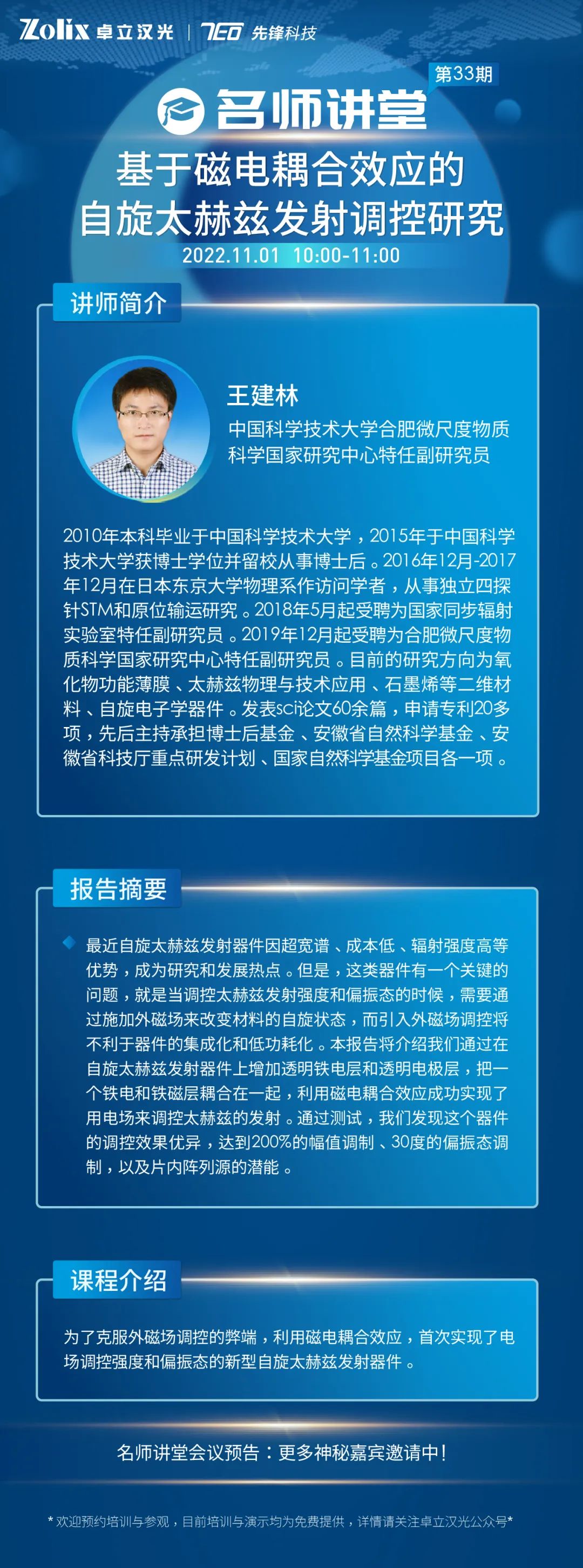 本期卓立漢光隆重邀請到了中國科學(xué)技術(shù)大學(xué)合肥微尺度物質(zhì)科學(xué)國家研究中心特任副研究員—王建林老師,王老師將與大家分享自己在基于磁電耦合效應(yīng)的自旋太赫茲發(fā)射調(diào)控研究領(lǐng)域的經(jīng)驗和心得體會。希望本次講座能夠為您的科學(xué)研究帶來靈感與助力,推動研究的進展,精彩不容錯過~
