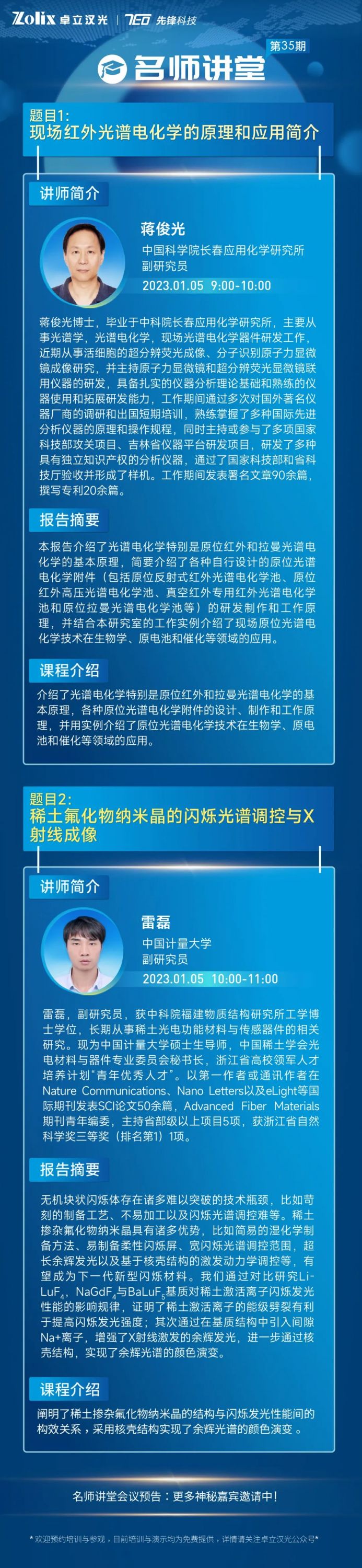 本期卓立漢光隆重邀請到了中國科學(xué)院長春應(yīng)用化學(xué)研究所,副研究員—蔣俊光老師和中國計量大學(xué),副研究員—雷磊老師,兩位老師將與大家分享自己科研領(lǐng)域的經(jīng)驗和心得體會。希望本次講座能夠為您的科學(xué)研究帶來靈感與助力,推動研究的進(jìn)展,精彩不容錯過,掃描下方的二維碼,趕快報名開啟學(xué)習(xí)之旅吧~第35期名師講堂