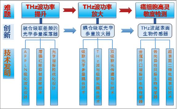 鑒于上述領(lǐng)域?qū)Ω吖β蔜Hz波輻射源的亟待需求,本項目針對THz波功率提升、THz波功率放大和癌細(xì)胞高靈敏度檢測三個國際科技難題展開,在2項國家自然科學(xué)基金項目和1項河南省自然科學(xué)基金的資助下,歷時8年取得了3大科技創(chuàng)新,形成了9項關(guān)鍵技術(shù)發(fā)明,如圖1所示,大幅度提高了THz波功率及量子轉(zhuǎn)換效率。