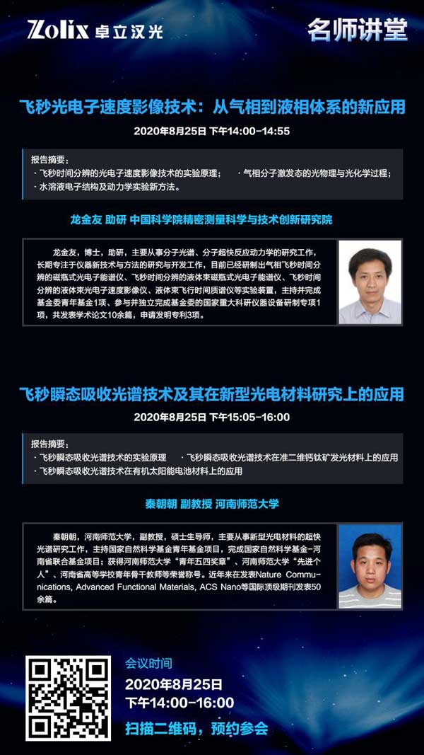 2020年8月25日下午14:00-16:00,卓立漢光將邀請(qǐng)兩位專家( 中國科學(xué)院精密測量科學(xué)與技術(shù)創(chuàng)新研究院龍金友老師與河南師范大學(xué)秦朝朝副教授),與大家在線上分享飛秒光電子速度影像技術(shù)&飛秒瞬態(tài)吸收光譜技術(shù)——新材料領(lǐng)域應(yīng)用