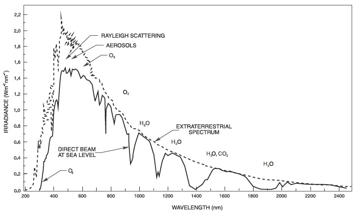 太陽光模擬器是用來模擬太陽光的光源,具有較高的太陽光譜匹配度、空間均勻性以及時間穩(wěn)定性。標(biāo)準(zhǔn)太陽光譜和穿透大氣層到達(dá)地球表面的太陽光譜如下: