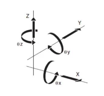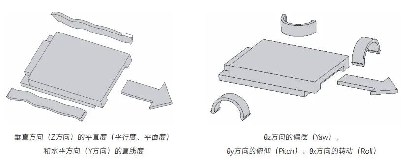 非軸向角度誤差有三個(gè)相互垂直的分量,分別是 :θz 方向的偏擺(Yaw)、θy 方向的俯仰(Pitch)和 θx 方向的轉(zhuǎn)動(dòng)(Roll)。