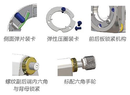 • 雙重裝卡:特別設(shè)計(jì)了彈性壓圈壓緊鏡片的裝卡方式,一定程度上可避免頂絲或硬性固定引起鏡片變形,提高光路穩(wěn)定性;如果您不想使用彈性壓圈,可自行將彈性壓圈取出,用側(cè)面頂絲固定即可