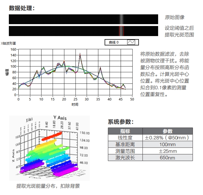 激光位移傳感器是被廣泛應(yīng)用的一種激光測(cè)距系統(tǒng)。原理是將發(fā)射點(diǎn)、目標(biāo) 點(diǎn)、接收點(diǎn)三者構(gòu)成一個(gè)空間三角形。通過已知的發(fā)射點(diǎn)和接收點(diǎn)兩者位置來算 出目標(biāo)點(diǎn)的位置。本系統(tǒng)是對(duì)激光三角法的有效驗(yàn)證。在實(shí)驗(yàn)條件狀態(tài)下,我們 是通過線陣相機(jī)記錄在全量程范圍內(nèi)的光點(diǎn)位置信息。可通過標(biāo)定數(shù)據(jù)的方式使 光點(diǎn)位置和測(cè)量距離形成映射,達(dá)到測(cè)量位移的目的??捎糜跍y(cè)距儀原理演示實(shí) 驗(yàn)、光點(diǎn)位置信息讀取算法驗(yàn)證、位置標(biāo)定算法驗(yàn)證等場(chǎng)景。